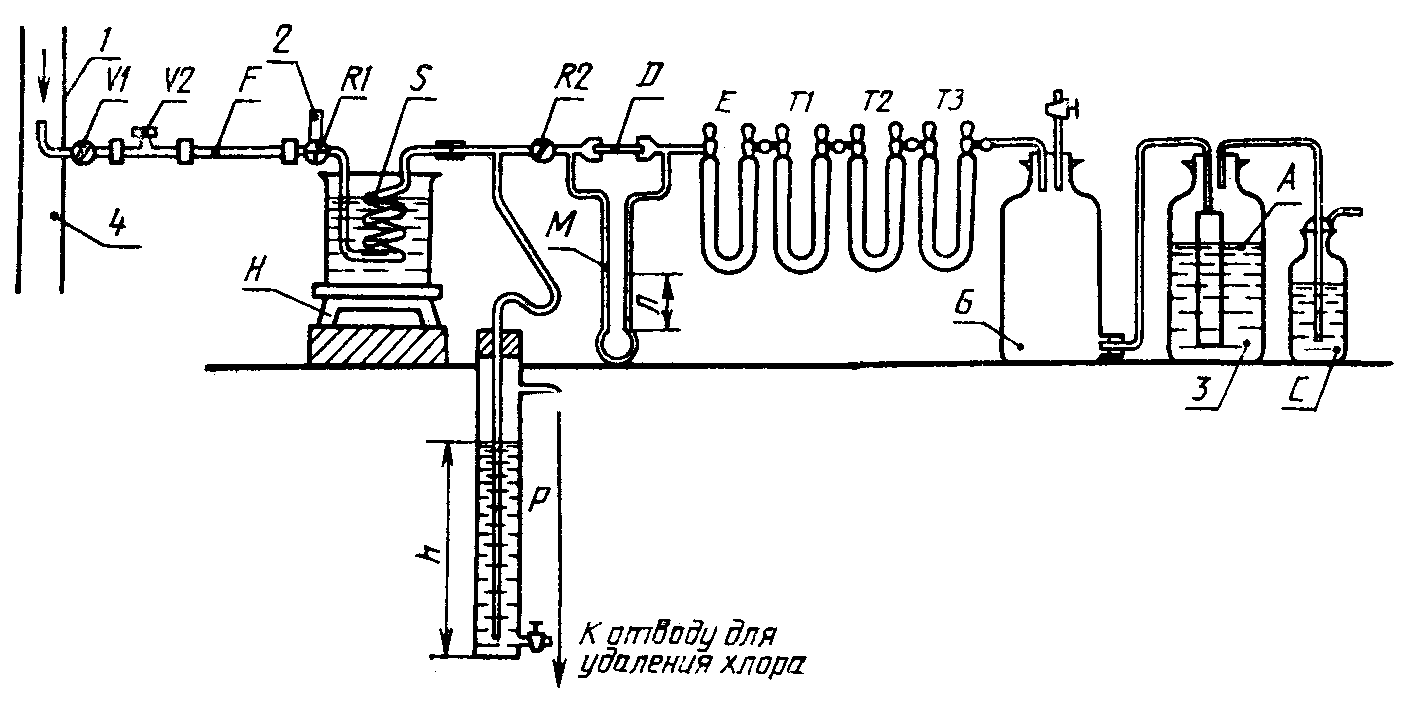 Поочередно открывают клапаны V1 и V2, поворачивают кран R1 так, чтобы отфильтрованный газообразный хлор поступал в направлении затвора P. Через 10 мин открывают проходной кран R2, чтобы поток хлора мог поступать в поглотительные трубки со скоростью 25 л/ч. Скорость потока хлора определяют по разности уровней n тетрахлорметана, находящегося в двух отводах дифференциального манометра M, расходомера D или по высоте шарика поплавкового расходомера. Поток хлора обеспечивают регулированием зазора (ширины проходного отверстия) клапанов и высоты h тетрахлорметана в затворе P.