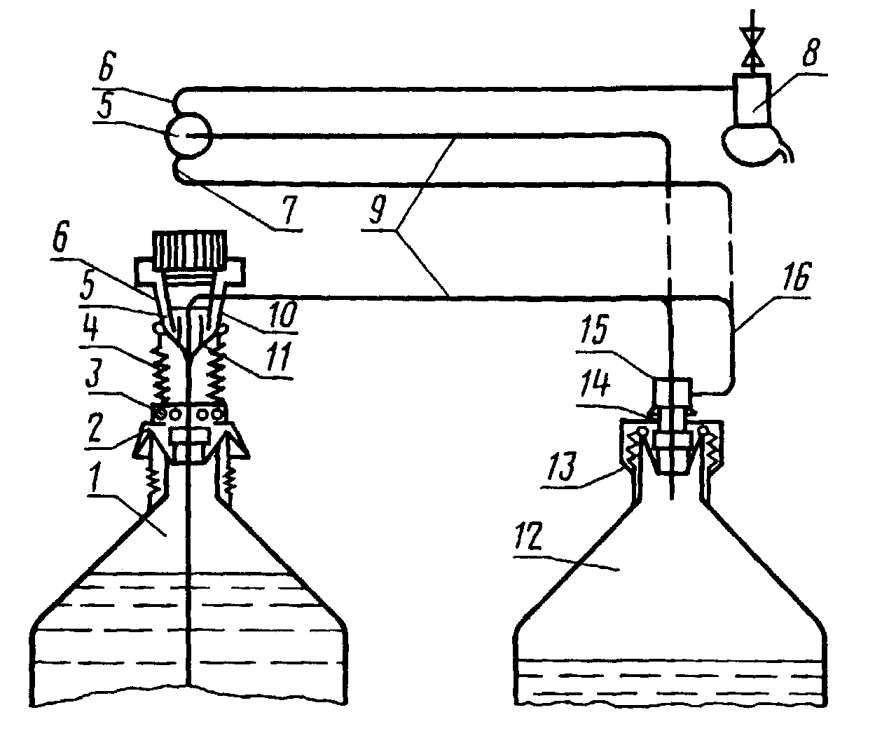 При заливе ампулы азотной кислотой из бюретки, в последнюю через наружный канал пробки крана засасывают атмосферный воздух, предварительно очищенный силикагелем от химических загрязнений, пропущенный через фильтр ФПП-Д для удаления аэрозолей и промытый водой. На ампулу с навеской надевают колокол 2 с термокарманом 7