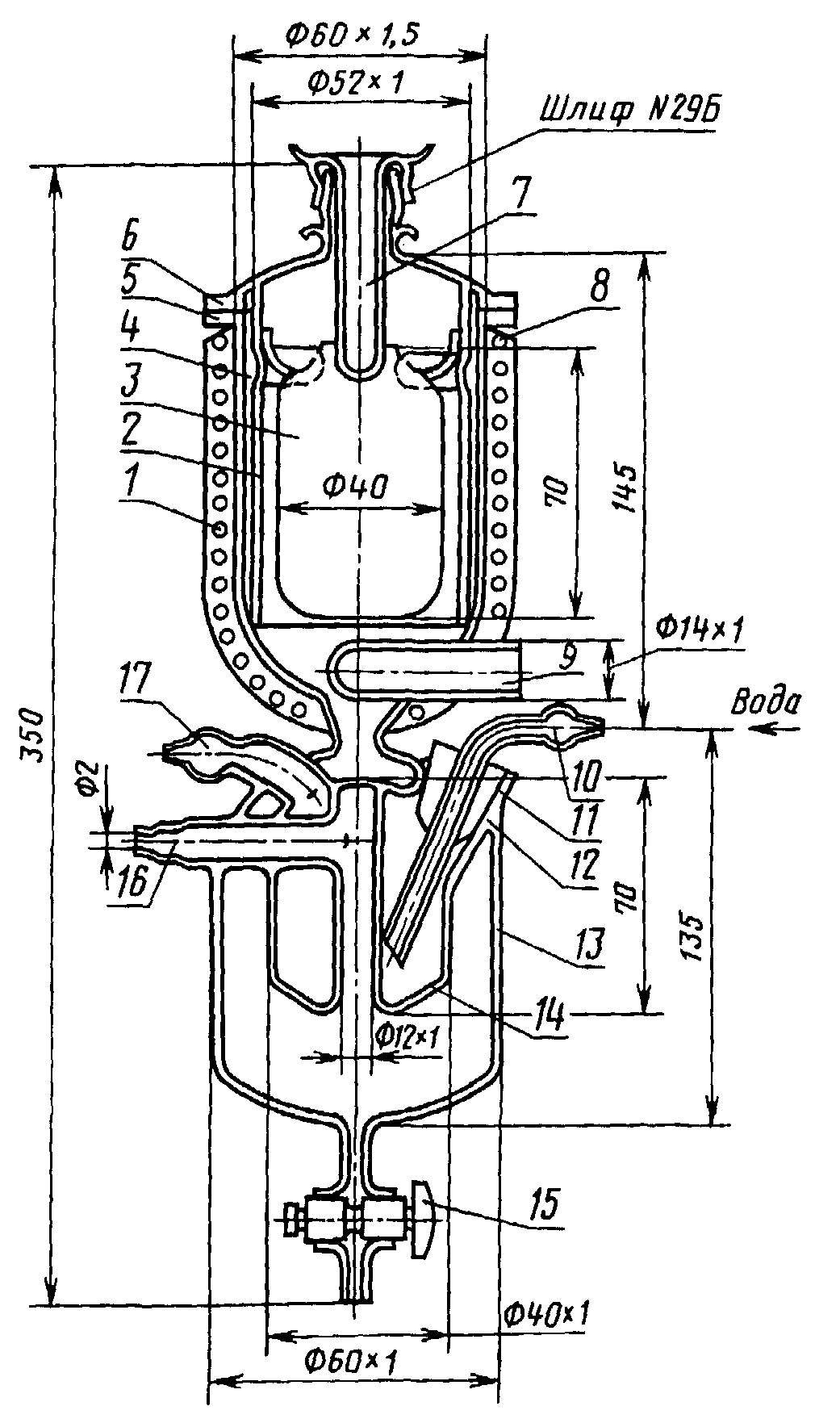 (черт. 12) заполняют хладагентом. Внутри конденсатора размещена емкость 14, заполняемая через воронку 11 хладагентом (жидкий азот, жидкий воздух и т.п.) или при его отсутствии водой, нагнетаемой по трубке 10, закрепленной в воронке 11 резиновой пробкой. Наружная стенка емкости 14 является охлаждающей поверхностью для конденсации паров. Газы или пары воды выводят из емкости 14 через штуцер 17.