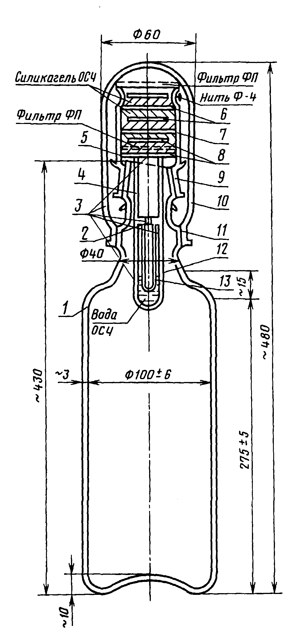 (черт. 13) до температуры окружающей среды. В наружную кольцевую емкость эксикатора засыпают хлористый кальций или силикагель, поверхность которого покрывают фильтром ФПП-Д для предотвращения попадания в ампулу влаги и пыли. Ампулу охлаждают в эксикаторе до постоянной массы.