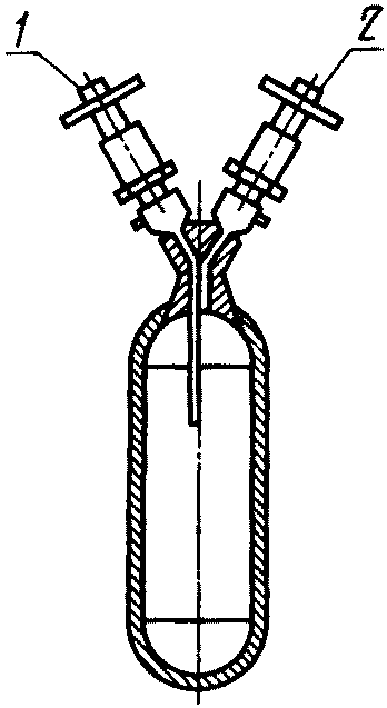 20 см3 сжиженного хлористого метила помещают в мерный цилиндр со шлифом, вместимостью 100 см3, предварительно охлажденный до минус 10 - 15 °C, на цилиндр надевают соединительную трубку, к которой присоединяют последовательно две склянки СН-2, содержащие по 10 см3 раствора гидроокиси натрия, и проводят испарение пробы со скоростью 50 - 60 пузырьков за 30 с. Время испарения (t) фиксируют в секундах. После полного испарения хлористого метила раствор из склянок переносят в выпарительную чашку вместимостью 100 см3 и промывают склянки водой по 5 см3 каждую.