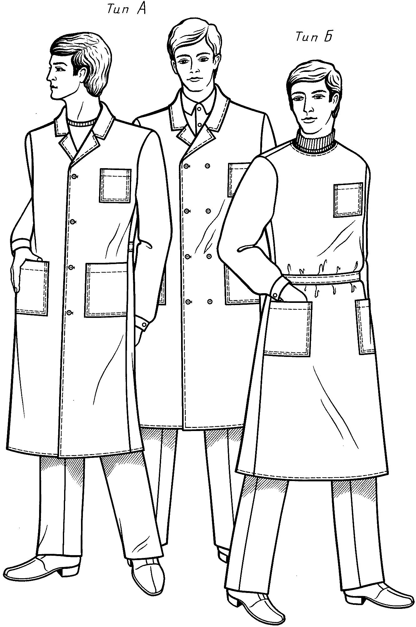 с воротником различной формы в халатах типов А и Б или без него, в халатах типа А;