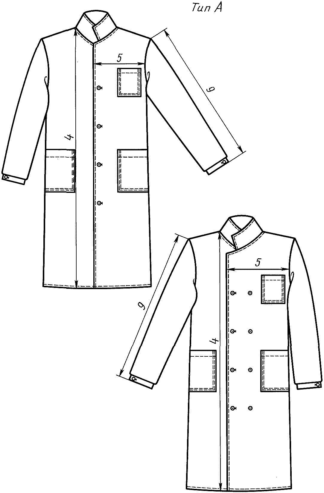 2.3.1. Халаты типа А - с центральной или смещенной бортовой застежкой на пуговицы, отложным воротником, внешними накладными карманами: двумя боковыми и одним верхним на левой полочке, втачными рукавами, с манжетами, застегивающимися на пуговицы.