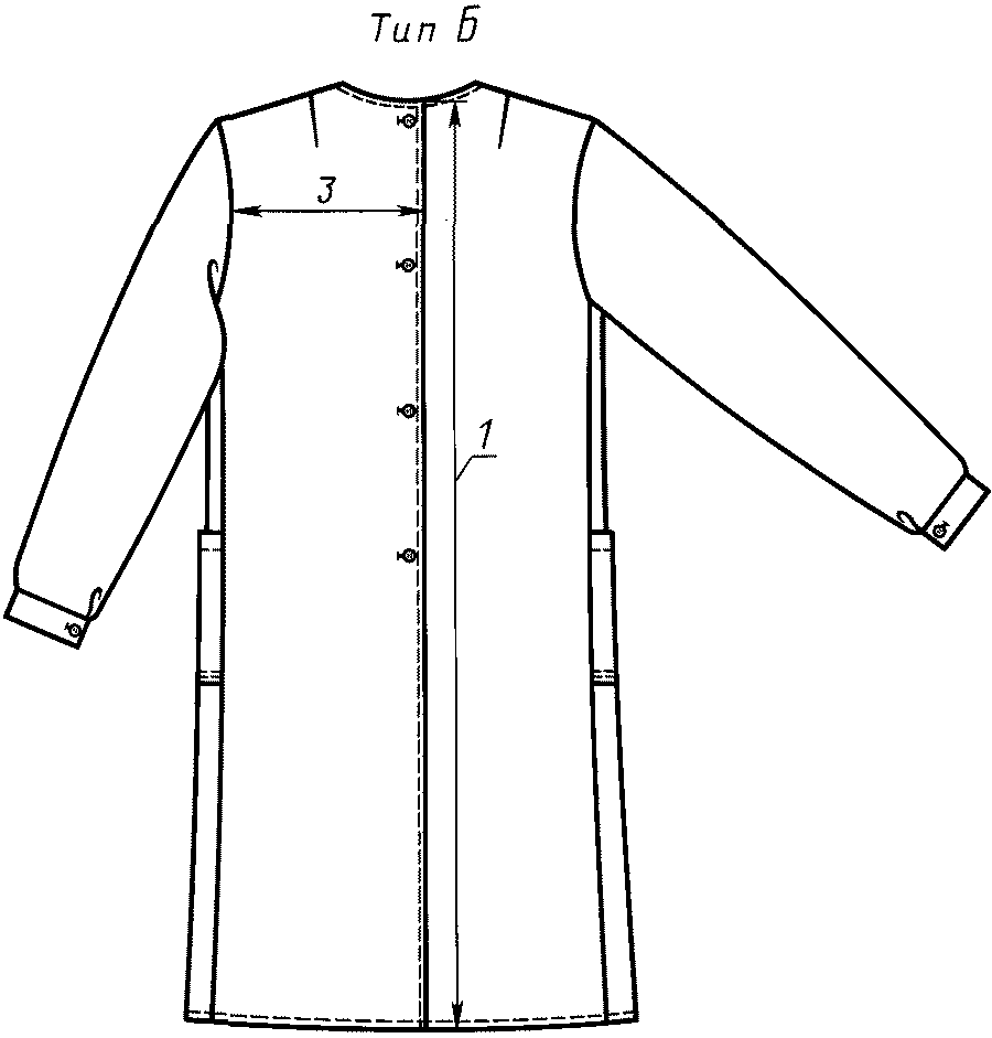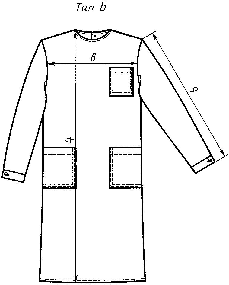 Халаты типа Б - с застежкой сзади на пуговицы, без воротника, с внешними накладными карманами: двумя боковыми и одним верхним на левой стороне переда, втачными рукавами с манжетами, застегивающимися на пуговицы, поясом по линии талии.