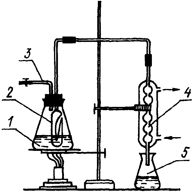 3, которая служит парообразователем, специального сосуда для продукта 2, погруженного в колбу, шарикового холодильника 4. Пар из колбы парообразователя попадает в специальный сосуд через трубку и, перемешивая продукт, увлекает в холодильник летучие кислоты. Для приема дистиллята служит коническая колба 5 вместимостью 250 см
