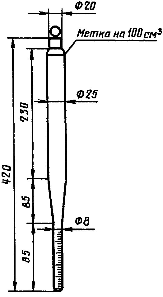 ГОСТ 21400, марки ХС1, представляющий собой цилиндр (внутренний диаметр 25 мм) с притертой пробкой и меткой на 100 куб. см, который вверху плавно переходит в другой градуированный цилиндр с ценой деления 0,1 куб. см (черт. 2); верхний цилиндр отстойника градуируется по НТД.