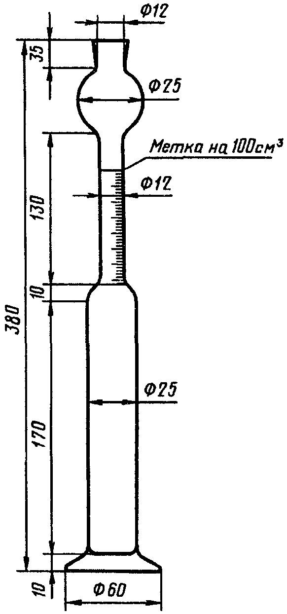 ГОСТ 21400, марки ХС1, представляющий собой цилиндр (внутренний диаметр 25 мм) с притертой пробкой и меткой на 100 куб. см, который внизу плавно переходит на градуированный конус с ценой деления 0,1 куб. см
