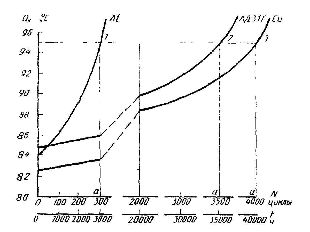 4. По зависимости температуры от времени, полученной для данного типа контактного соединения, определяют средний срок его службы, т.е. находят точку "а" по допустимой температуре нагрева, как показано на чертеже.