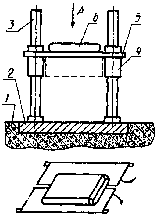 1 - фундамент; 2 - стальная плита; 3 - направляющая; 4 - подъемный механизм; 5 - створки; 6 - испытываемый образец