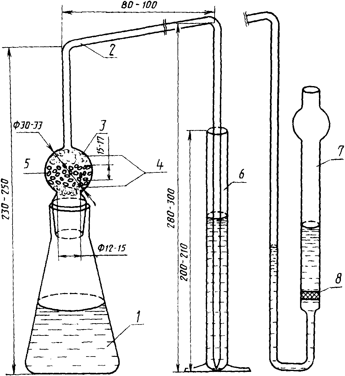 3.3.1. Прибор собирают в соответствии с чертежом. Прибор включает реакционную колбу вместимостью 250 см3, соединительную трубку (внешний диаметр 4 мм) с расширением, шлифом и капилляром, цилиндр (внутренний диаметр 11 мм) с поглощающим раствором или поглотительный прибор с пористой стеклянной пластинкой для поглощения раствора. Перед употреблением прибор промывают разбавленной азотной кислотой (1:1), а затем водой.