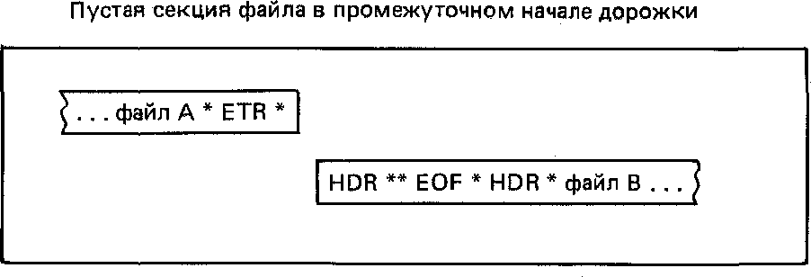 6.5.6.2. Маркер конца ленты встречается во время записи группы конечных меток файла, причем файл не является последним в наборе файлов. В этом случае система завершает запись группой конечных меток файла. Группа начальных меток файла для следующего файла записывается как предшествующая пустой секции файла, а дорожка заканчивается группой конечных меток дорожки. Затем в начале следующей дорожки, непосредственно за меткой STR1, перезаписывается группа начальных меток файла.
