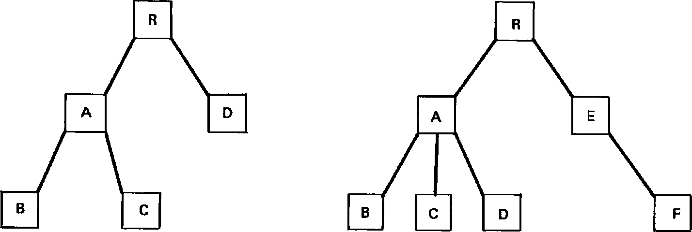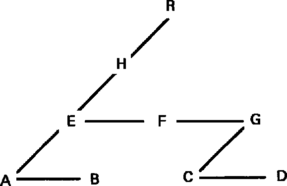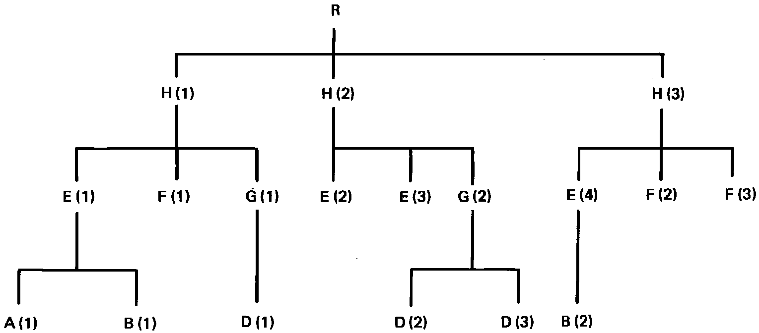Характерный пример предыдущей общей структуры, имеющей множество случаев употребления полей данных с одной и той же меткой поля, представлен на черт. 15, где R является меткой поля уникального идентификатора записи, а упорядоченные индексы (в скобках) для повторяющихся меток полей добавлены для ясности. Последовательность прямого обхода будет - RH(1) E(1) A(1) B(1) F(1) G(1) D(1) H(2) E(2) E(3) G(2) D(2) D(3) H(3) E(4) B(2) F(2) F(3), которую можно записать без индексов в скобках, не потеряв смысла. Отметим, что только корневой узел R уникален, а поля H, E, A и т.д. могут встретиться несколько раз, и в этом случае они обозначены повторением одной и той же метки поля.