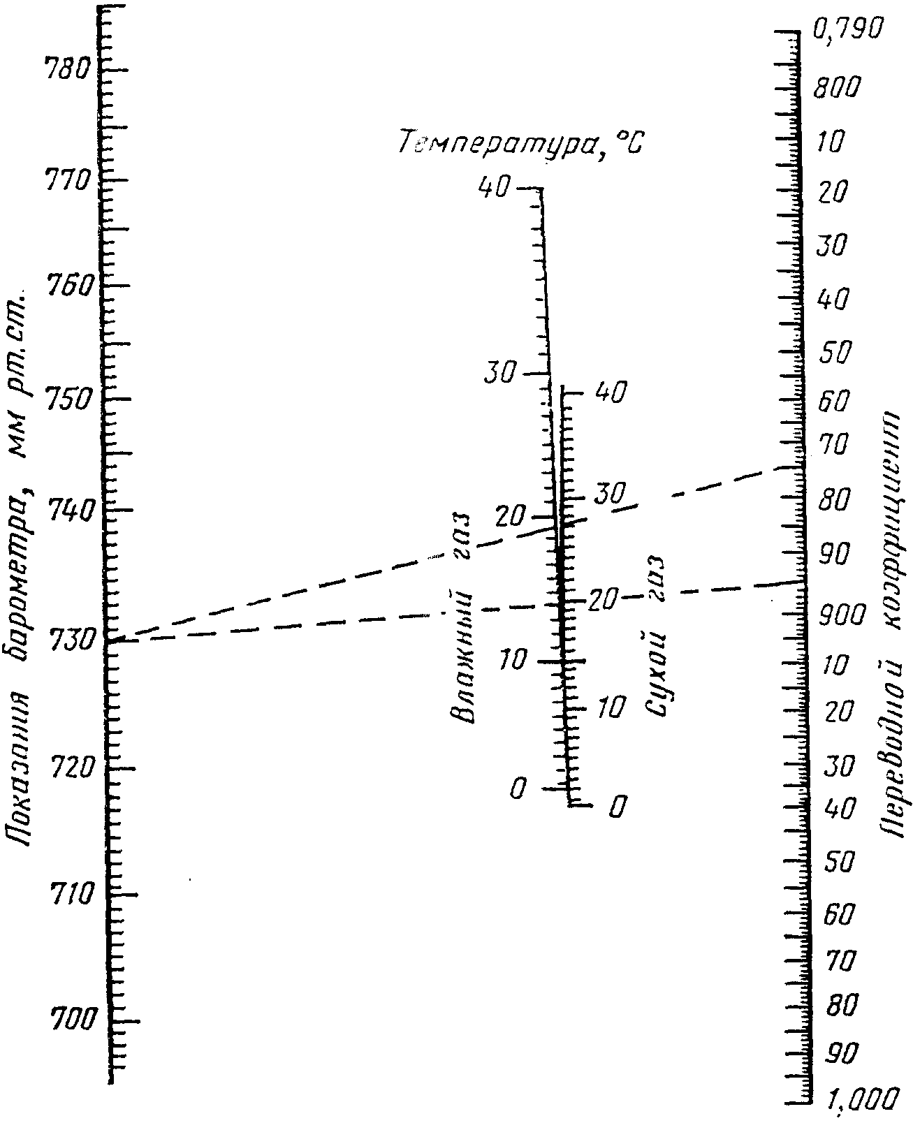 Для пользования номограммой линейкой соединяют точки, соответствующие данным давлениям и температурам, и в точке пересечения их со шкалой, находящейся справа, находят искомый переводный коэффициент (K1).