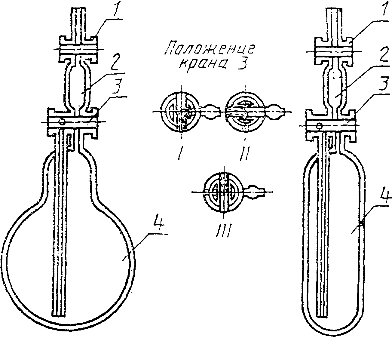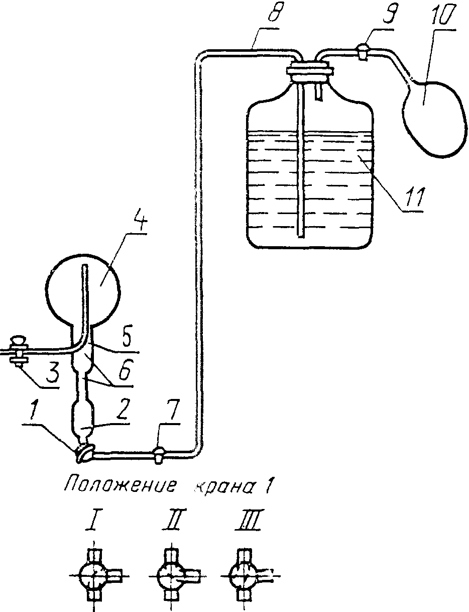 Заполняют колбу 2 сосуда для анализа через кран 1 раствором однохлористой меди, предварительно сливая из сифона первую порцию раствора и закрывают кран 1.
