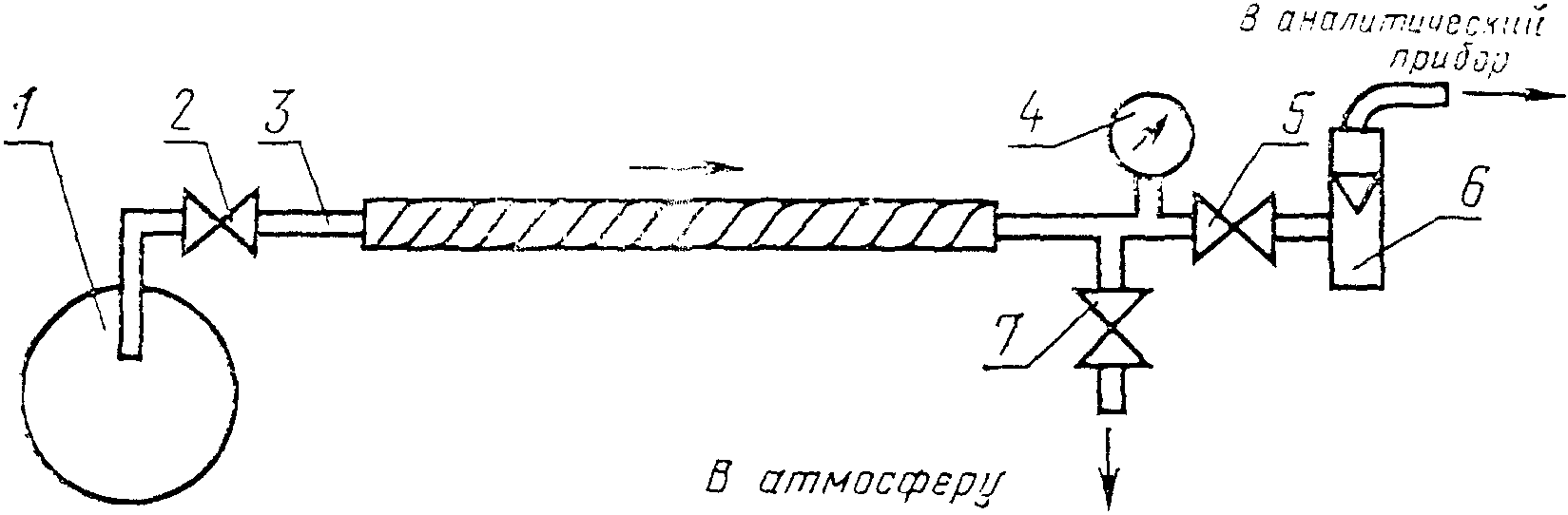 Устанавливают поглотительный сосуд на максимально близком расстоянии от баллона. Подсоединяют поглотительный сосуд к баллону, предварительно открыв краны сосуда. Открывают баллон и устанавливают необходимый расход газа по газовому счетчику типа ГСБ-400. Пропускают 10 - 20 дм3 водорода со скоростью 100 - 120 см3/мин. Отсоединяют поглотительный сосуд, предварительно закрыв краны, и взвешивают (результат взвешивания записывают с точностью до четвертого десятичного знака). Одновременно регистрируют показания термометра, барометра и газового счетчика.