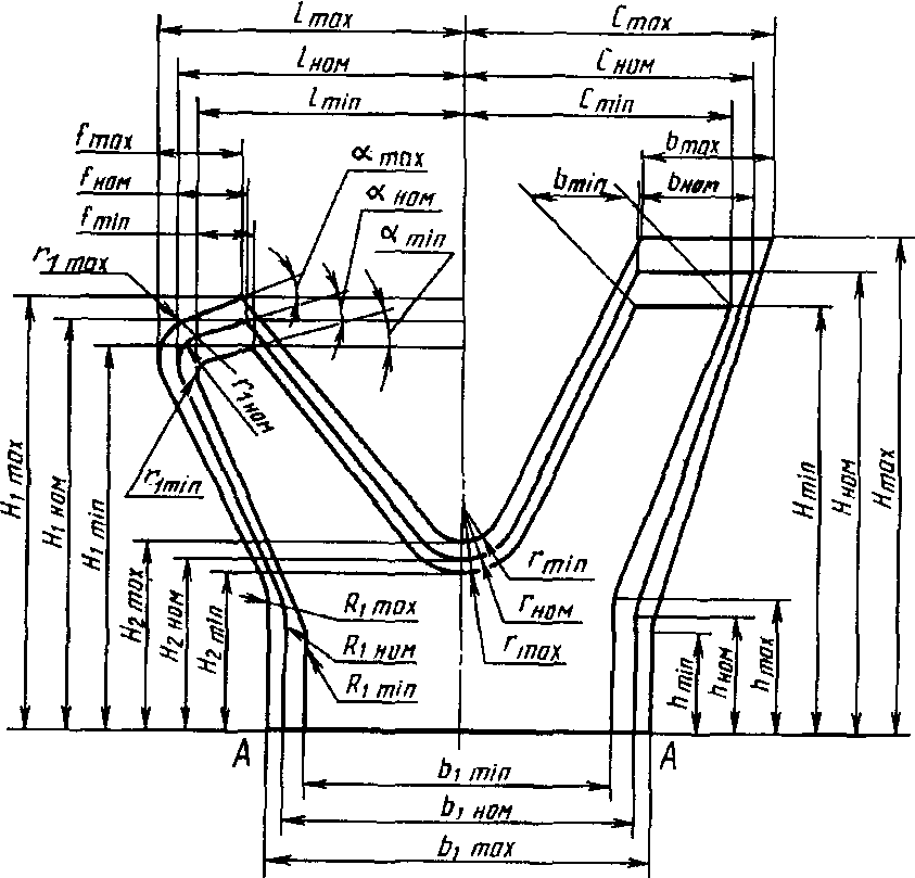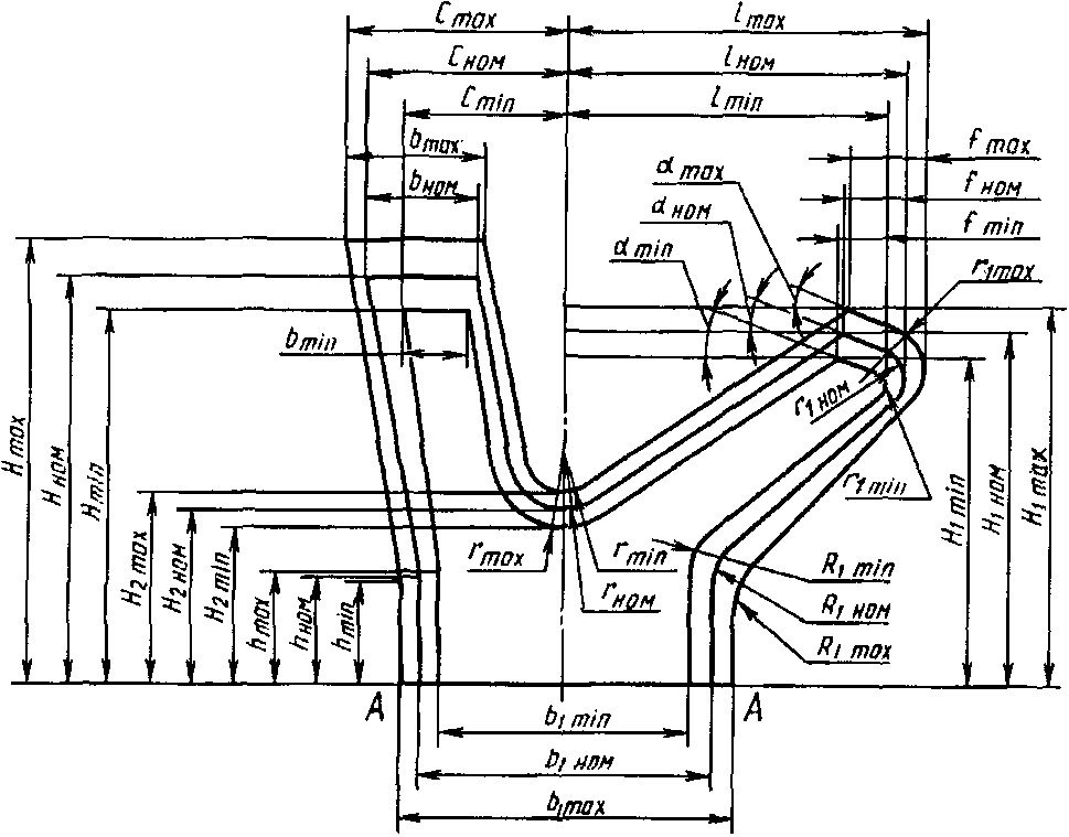 3.3.2. Отложить от линии AA максимальные, номинальные и минимальные высоты манжет H и H1 (Hmax, Hном, Hmin, H1max, H1ном, H1min) и провести через них линии, параллельные линии AA.