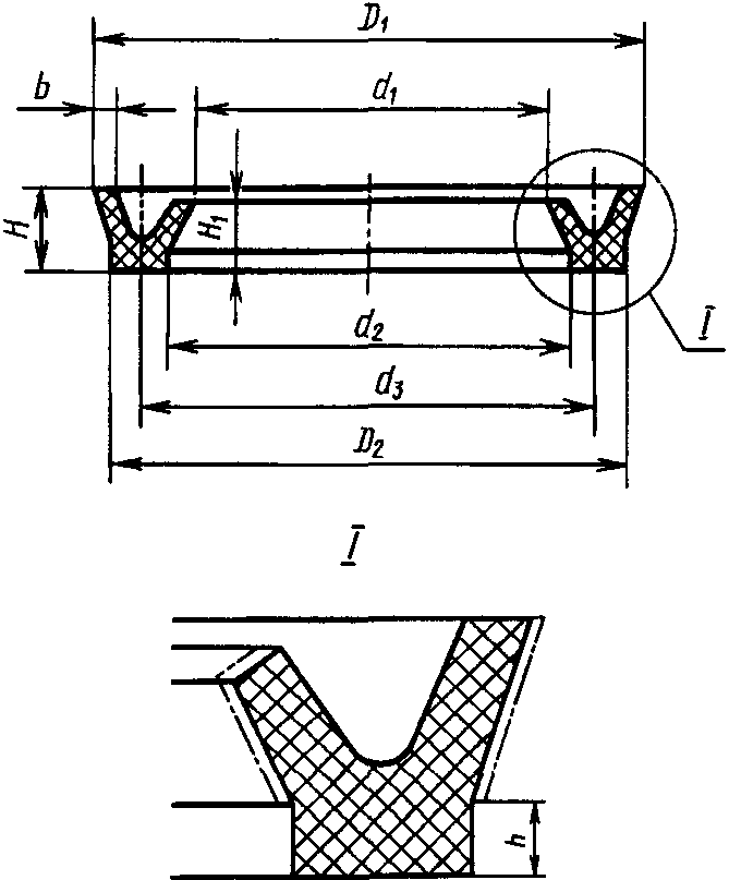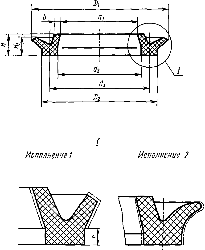 черт. 2. Профили манжет типов 1 и 2 должны находиться между максимальными и минимальными сечениями шаблона манжеты.