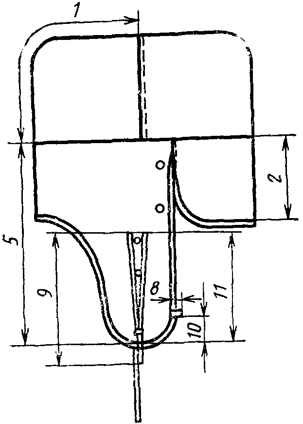 В шапке-ушанке типа Б для изготовления центральной петли на правом наушнике продевают через два отверстия тесьму и концы ее завязывают узлом со стороны подлицевого наушника, на расстоянии 2 см от сгиба тесьму скрепляют тройной обратной строчкой; одно отверстие расположено на расстоянии 4 - 5 см от лицевого края, второе - на расстоянии 1,5 - 2 см от первого; с лицевой стороны подлицевого правого наушника притачивают двойной-тройной обратной строчкой боковую петлю на расстоянии 4,5 см от верхнего края, выпуская край петли на 0,3 - 1,0 см за боковой срез детали, ширина шва 0,4 - 0,5 см. Количество стежков - 20 - 25 на 5 см строчки.