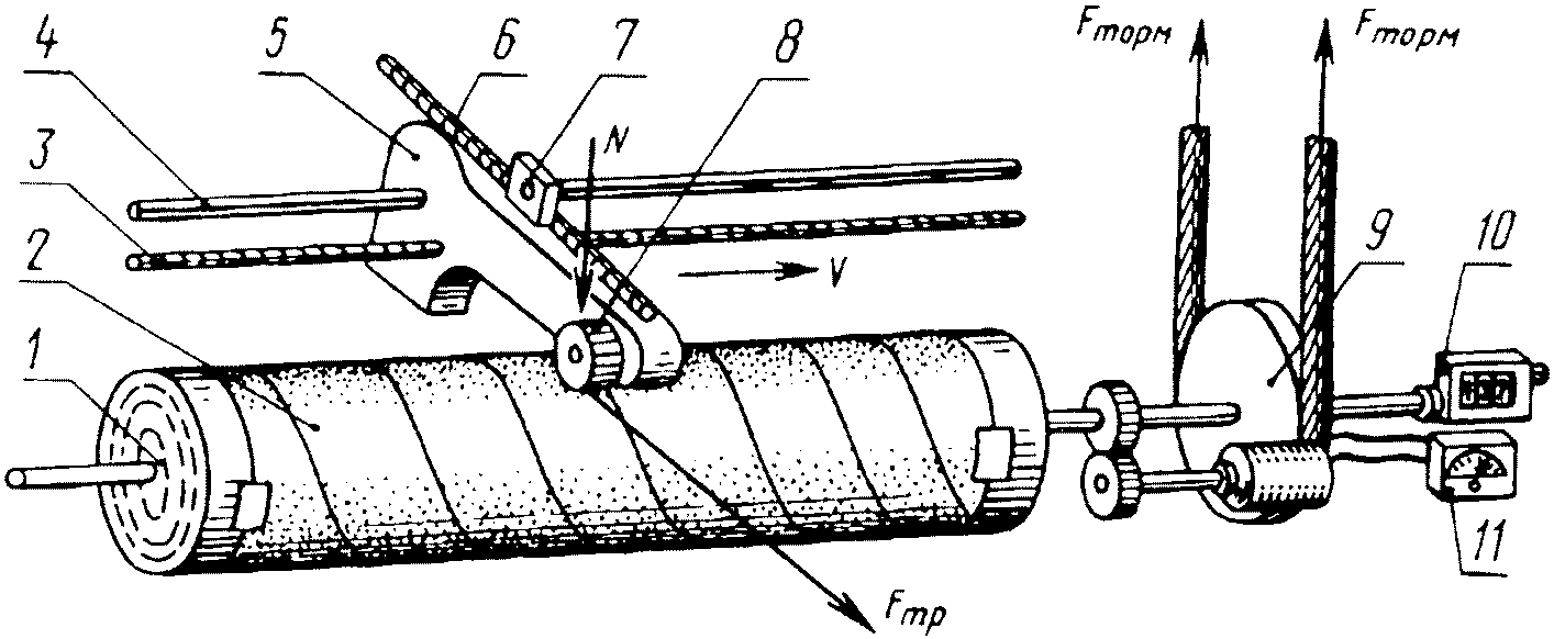 Под действием силы трения вращается барабан с навитой на нем по спирали лентой шлифовальной шкурки. Тормоз-силоизмеритель осуществляет торможение барабана в заданной степени и позволяет измерить силу трения.