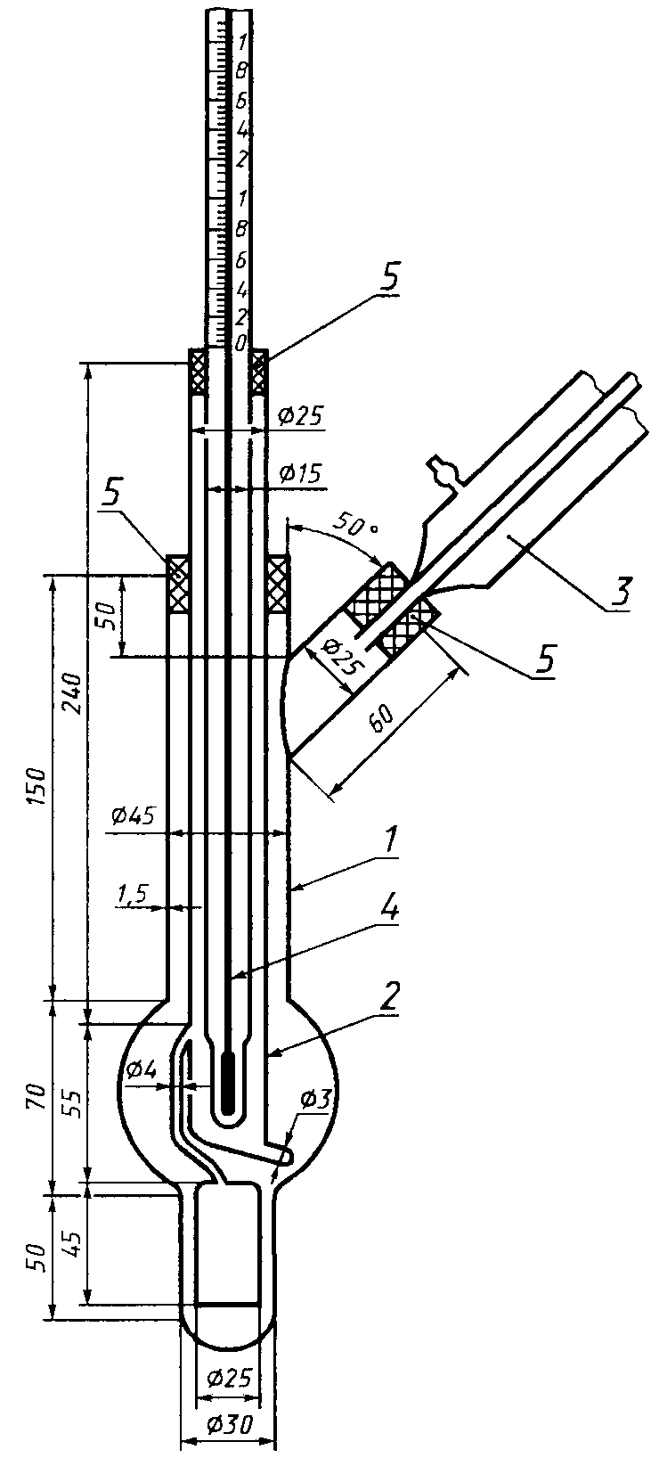 В прибор наливают 35 - 40 см3 дистиллированной воды, закрывают его корковой пробкой с вставленным в нее термометром, нагревают воду до интенсивного кипения и отмечают показания термометра. Термометр должен быть отрегулирован так, чтобы температура кипения соответствовала около 5 °C по основной шкале термометра.