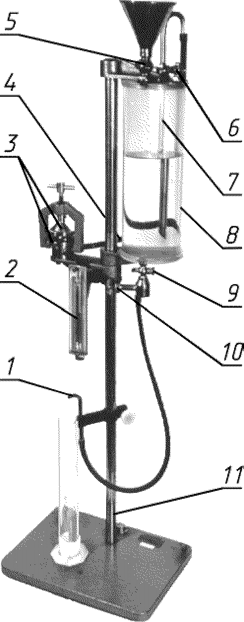 На штативе 11 помещен цилиндрический сосуд 8, соединенный резиновой трубкой 4 с зажимом для закрепления образца 3.