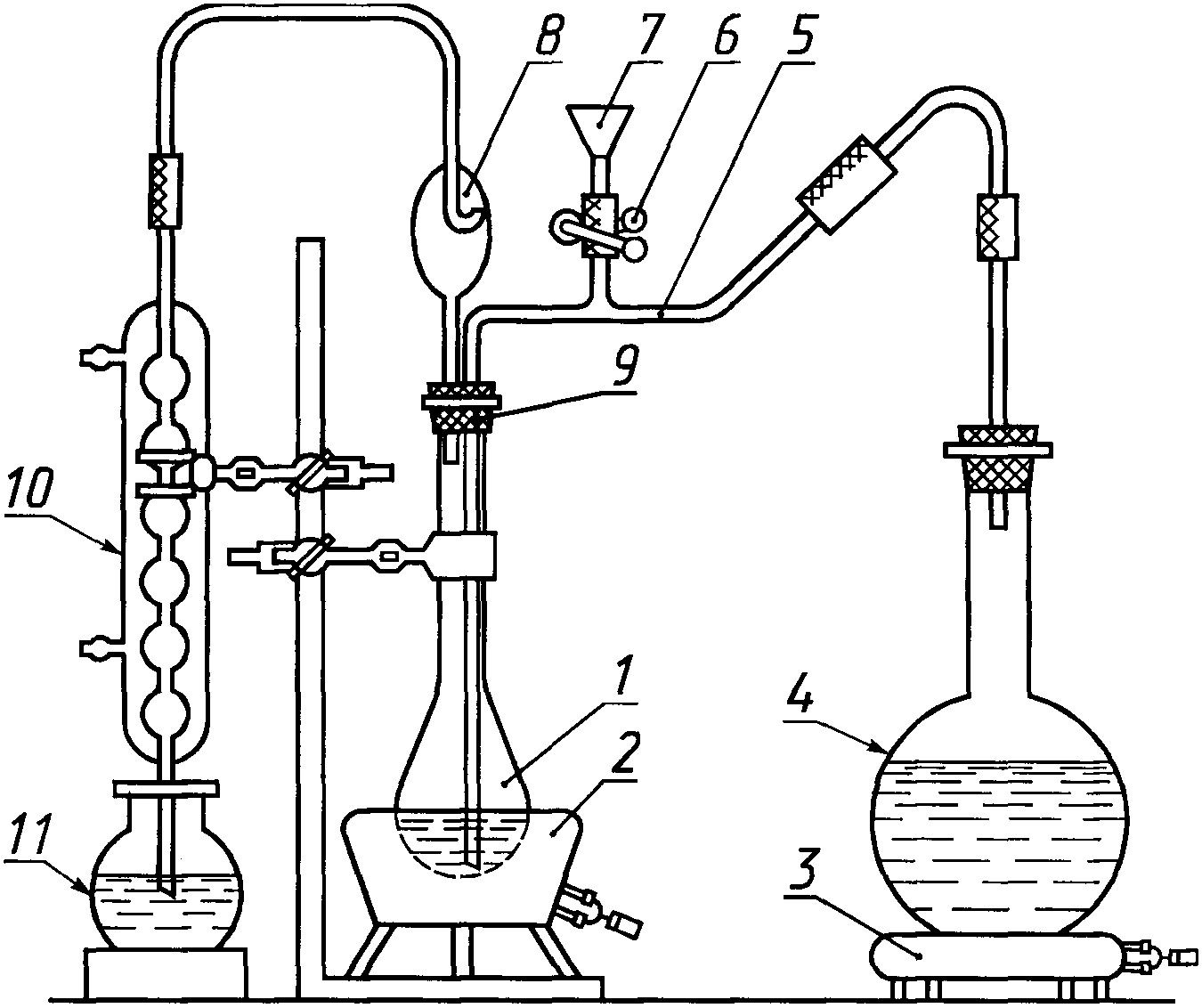 9 - пробка; 10 - холодильник; 11 - приемная колба