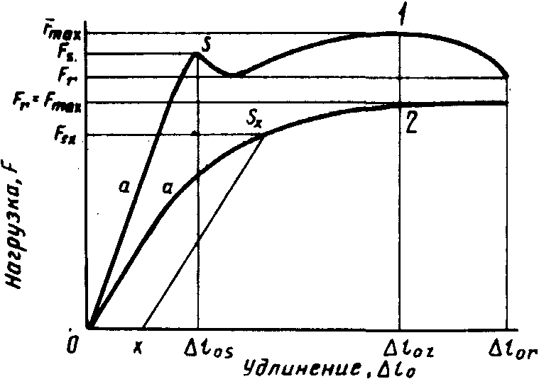 Условный предел текучести | Sx | - | Определяют в тех случаях, когда испытуемый материал не имеет предела текучести. Sx определяют графически в точке пересечения кривой "нагрузка - удлинение" с прямой, проведенной параллельно прямолинейному начальному участку кривой "нагрузка - удлинение" и отсекающей от оси абсциссы участок удлинения, отвечающий относительному удлинению, например 1% (см. чертеж, кривая 2) |