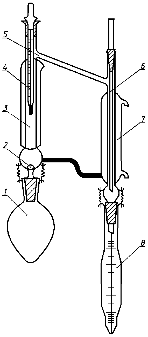 холодильника 7 с компенсационной трубкой 6, вставленной в верхнюю часть холодильника для уравнивания давления; при необходимости основной холодильник удлиняют вторым холодильником; при использовании одного холодильника применяют короткую компенсационную трубку, при использовании двух холодильников - длинную;