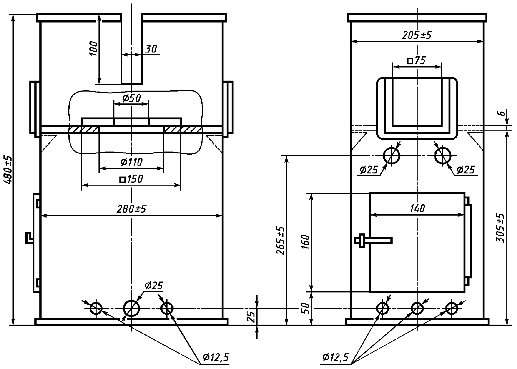(черт. 4), изготовленного из листовой стали толщиной 0,8 - 1 мм в форме правильной призмы, открытого сверху и снизу; в передней стенке кожуха находится дверца; над дверцей и на задней стенке кожуха находятся окошки из тугоплавкого стекла или слюды, в верхней части одной из боковых стенок - вырез; в передней и задней стенках кожуха на высоте 265 мм от основания расположены два отверстия диаметром 25 мм, центры которых находятся на расстоянии (68 +/- 1) мм от боковых кромок. Внутри кожуха на опорах из листового железа помещают пластинки 2 из теплостойкого материала толщиной 6 мм. В центре нижней пластинки, плотно прилегающей к стенкам кожуха, должно быть отверстие диаметром 110 мм, в центре верхней пластинки размером 150 x 150 мм должно быть отверстие диаметром 50 мм. Края пластинок из теплостойкого материала должны быть защищены от крошения пропиткой жидким стеклом. Допускается использование других конструкций кожуха, при этом модификация не должна влиять на тепловой режим перегонки;