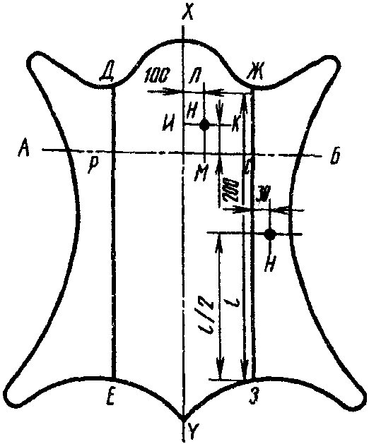 в полах - на расстоянии 30 мм от середины линий ДЕ и ЖЗ или РЕ и СЗ (в случае отделения при чепраковании воротка по линии АБ), отделяющих полы от остальной части шкуры.