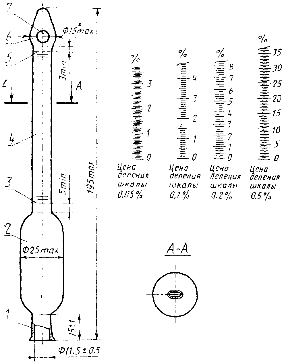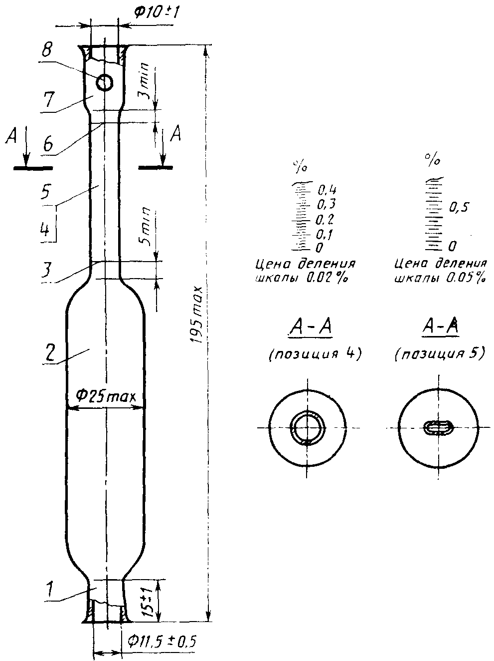 4, 5 - шкала; 6 - конечная отметка шкалы; 7 - горловина;