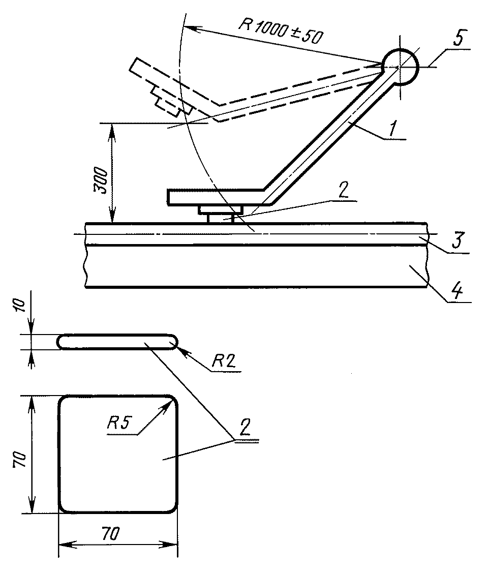 ГОСТ 380, диаметром (150 +/- 5) мм, закрепленный вертикально и выступающий над ее поверхностью на 200 мм. Радиус закругления краев стержня не должен превышать 6 мм. Радиационную головку сбрасывают один раз так, чтобы при падении она ударилась плоскостью днища о стержень.