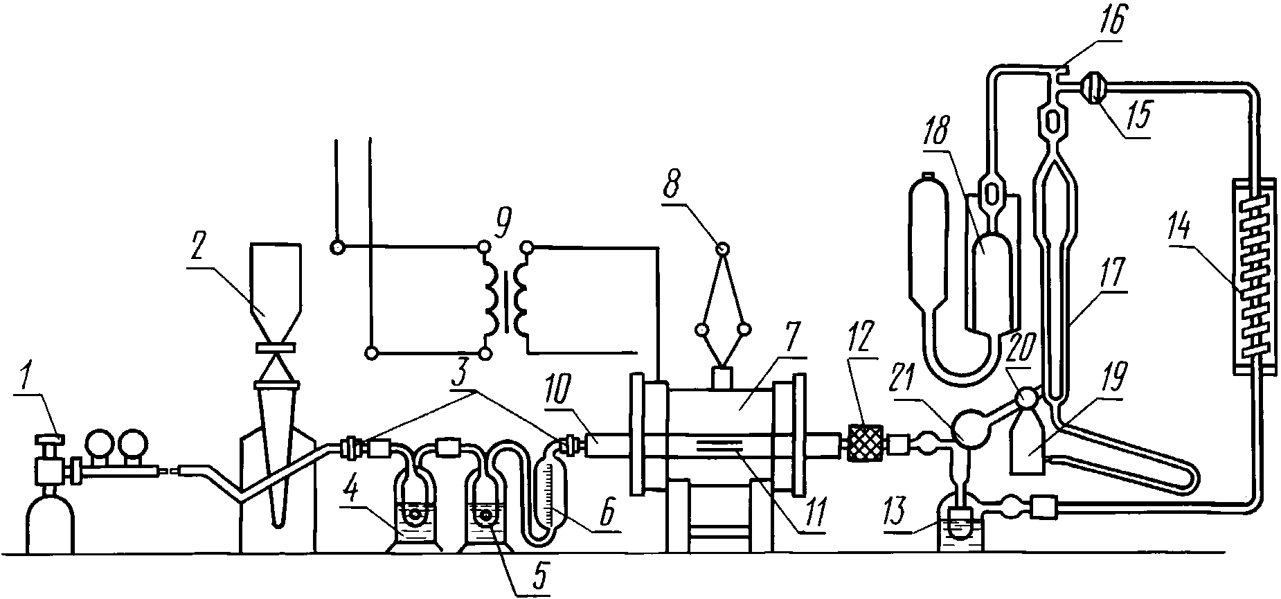 Установка для определения массовой доли углерода состоит из следующих элементов: баллона с кислородом