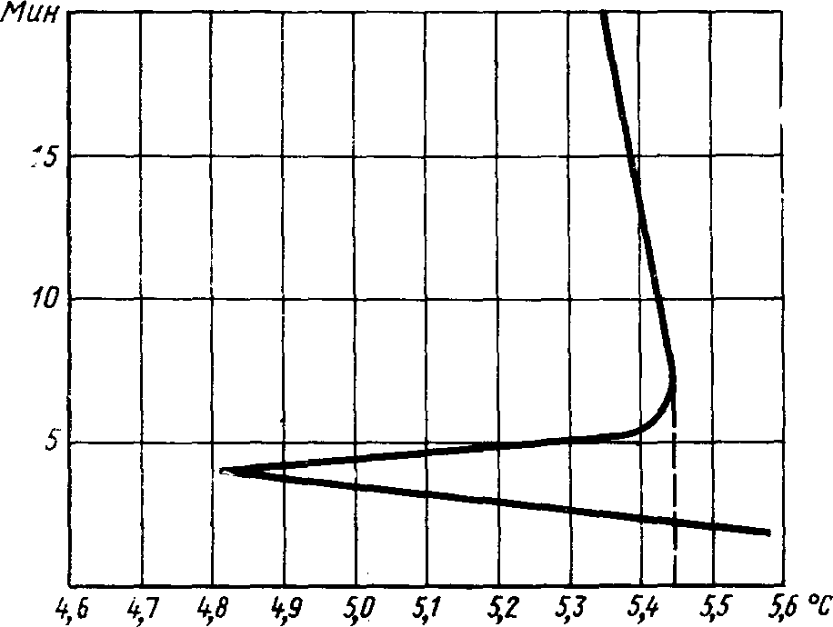 Температуру кристаллизации анализируемого продукта определяют по кривой (черт. 4), записанной регистратором. За температуру кристаллизации принимают точку, соответствующую максимальному подъему кривой кристаллизации с точностью до 0,005 °C.