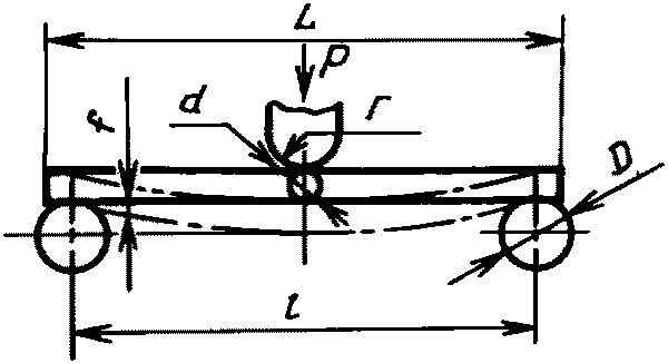 3.5.3. Стрелу прогиба f - максимальный изгиб, предшествующий началу разрушения образца, - измеряют по направлению действия нагрузки в месте излома образца.