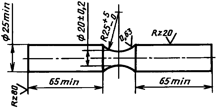 2.1.2. Для испытаний изготовляют цилиндрические образцы номинальным диаметром 10, 15, 20, 25 мм. Допускается изготовление образца другого диаметра в интервале от 10 до 25 мм. Диаметр заготовки должен не менее чем на 5 мм превышать диаметр образца.