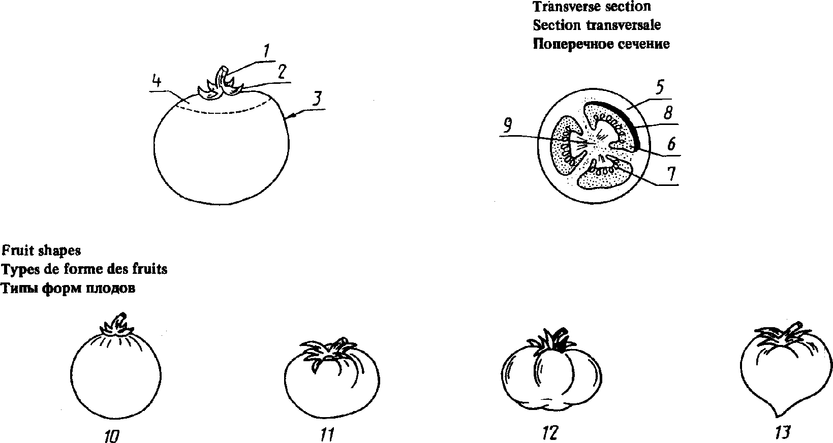 For each fruit or vegetable, the botanical name is given first, followed by the common name in English, French and Russian. | Pour chaque fruit ou | Для фруктов и овощей даны их ботанические названия на латинском языке и эквивалентные общепринятые названия на английском, французском и русском языках. |