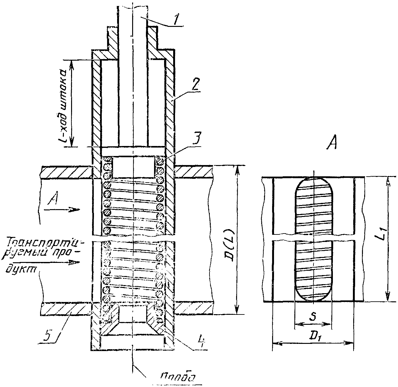 (черт. 2) представляет собой каскад соосно расположенных армирующих колец, в качестве которых может быть использована цилиндрическая пружина. Вплотную к пробоотбирающему элементу установлен жесткий направляющий каркас, имеющий продольный разрез длиной, равной высоте пересекаемого потока опробуемого продукта. Верхний торец пробоотбирающего элемента соединен со штоком, а нижний - с пробопередающей втулкой.