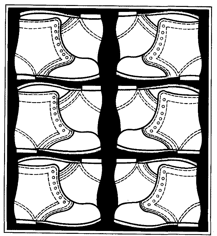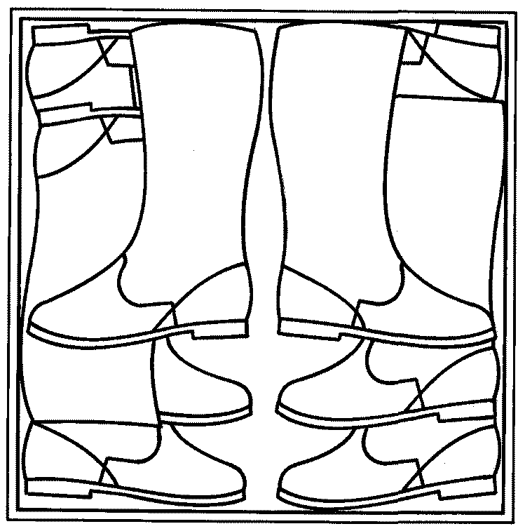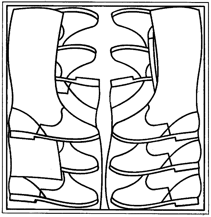юфтевые и с голенищами из искусственной кожи | - | " | Попарно связанные сапоги укладывают в ящик рядами без загиба голенищ таким образом, чтобы одна полупара была сдвинута по отношению к другой на высоту задника. Первый ряд укладывают: по две пары вдоль длинной стороны ящика с расположением пяточной части сапог по углам ящика, пятую пару - посередине ящика носочной частью к стенкам ящика (черт. 1). Второй ряд укладывают так же, как первый, за исключением пятой пары, которую укладывают носочной частью внутрь ящика носками навстречу друг другу (черт. 2) и каждый ряд обуви перекладывают оберточной бумагой |