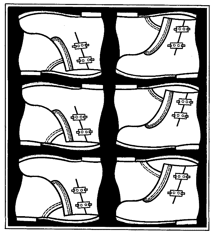 п. 1.1, наносят между ушками и передней частью голенищ на расстоянии 25 - 40 мм от верхнего края, в сапожках и полусапожках с замками "молния" - на клапане под застежку по его длине.