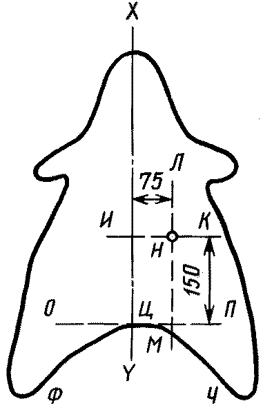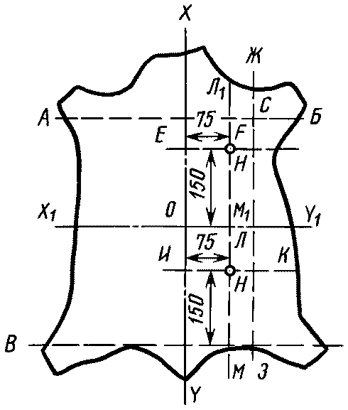 на целых кожах, полукожах и полукожах от огузочной части на пересечении линии ЛМ, расположенной на расстоянии 75 мм от хребтовой линии XY, с линией ИК, расположенной на расстоянии 150 мм от линии заднего реза ВГ (черт. 1);