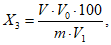 Кислотность X3 в миллиэквивалентах, т.е. в см3 0,1 моль/дм3 раствора гидроокиси натрия или гидроокиси калия в пересчете на 100 г продукта вычисляют по формуле