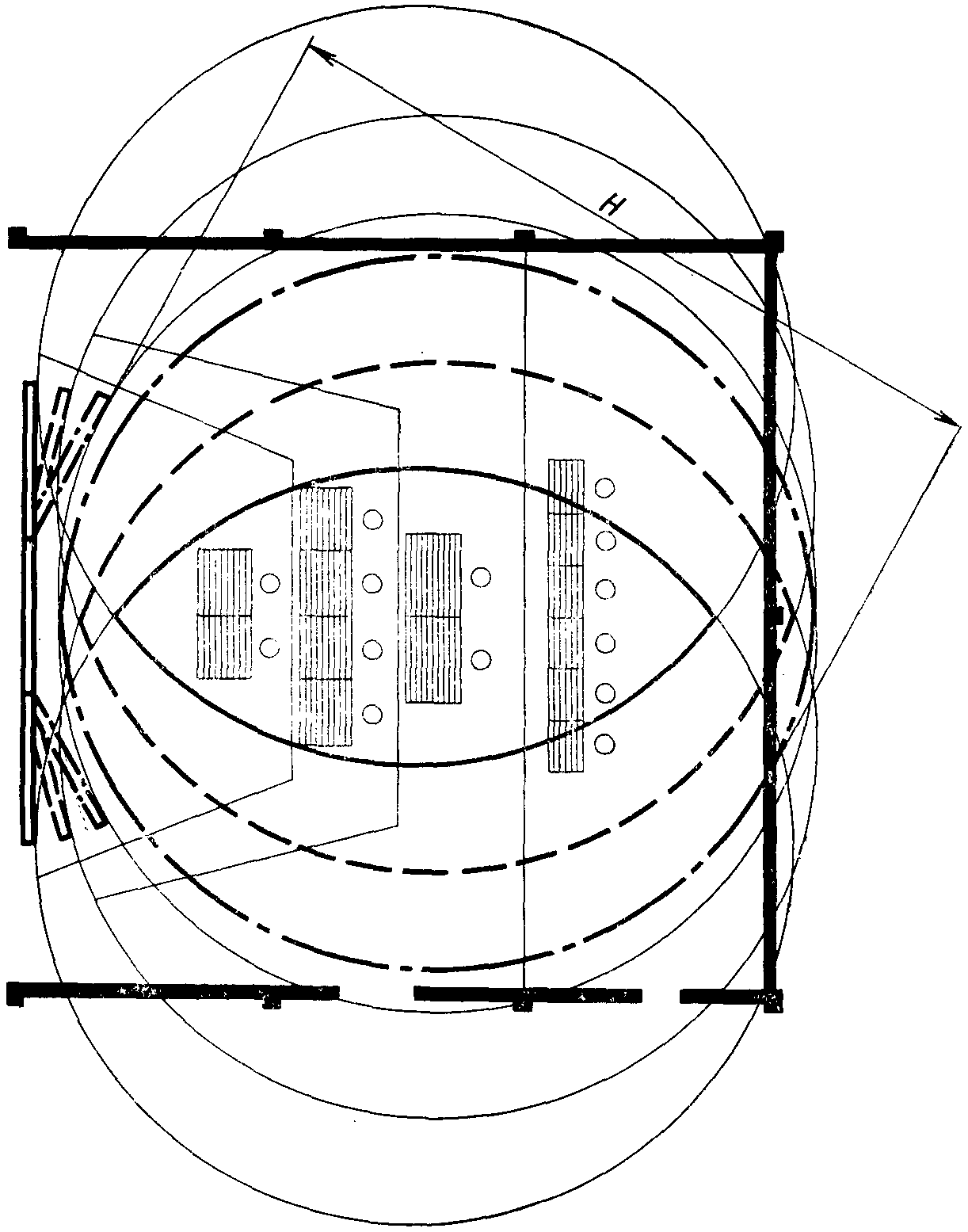 2.5. Построение в плане зоны наилучшего видения для залов и кабин с коллективными средствами отображения информации, представляющими плоский экран и экраны с повернутыми боковыми секциями, приведено на черт. 2.