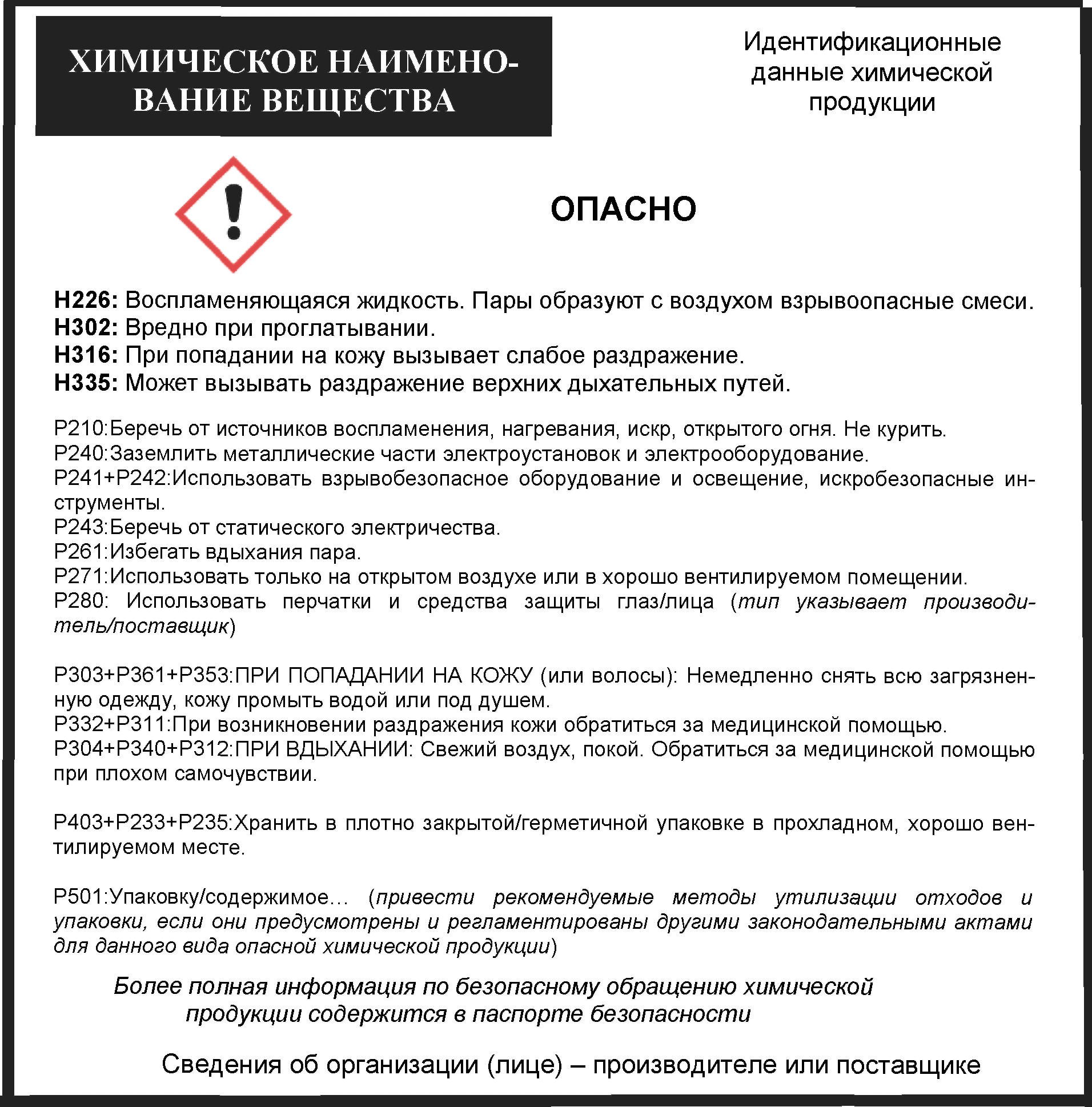 Примечание. Меры по предупреждению опасности для данного вида продукции рекомендуется дополнить условиями безопасного хранения, а также методами утилизации отходов продукции и упаковки (P501: Упаковку/содержимое...). Методы утилизации отходов указывают на предупредительной маркировке обязательно в том случае, если они предусмотрены и регламентированы другими законодательными актами для данного вида опасной химической продукции. | ||||