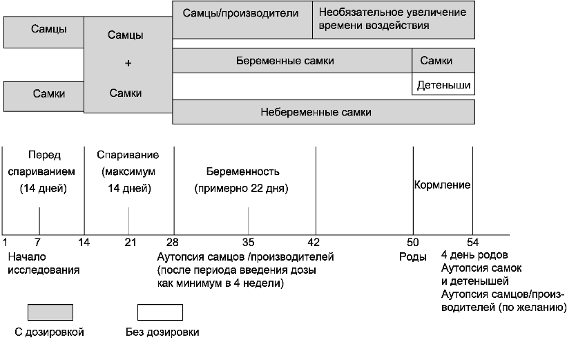 Введение дозы животным обоих полов следует начинать, как минимум, за две недели до спаривания, после прохождения ими пятидневной акклиматизации. Исследование должно быть запланировано таким образом, чтобы спаривание начиналось сразу по достижению животными половой зрелости. Этот период может слегка различаться для разных видов крыс. Например, крысы вида Sprague Dawley - в возрасте 10 недель, крысы вида Wistar - 12 недель. Самки с потомством должны умерщвляться на четвертый день после родов или вскоре после этого. День родов (т.е. когда роды завершились) считается нулевым днем после родов. Самки, не демонстрирующие признаков беременности, умерщвляются на 24 - 26 день после последнего дня периода спаривания. Введение доз животным обоих полов продолжается весь период спаривания. Самцам продолжают введение доз после периода спаривания, пока минимальный период дозировки не достигнет 28 дней. Затем их умерщвляют или сохраняют и продолжают дозирование для возможного второго спаривания, если необходимо.