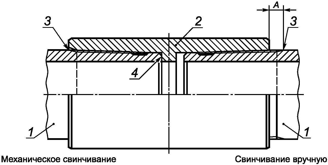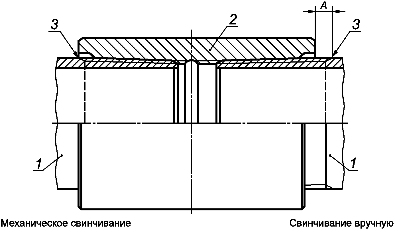 Натяг резьбы трубы, определяемый как расстояние между плоскостью торца трубы и измерительной плоскостью резьбового калибра-кольца, должен быть равен (2,5 +/-