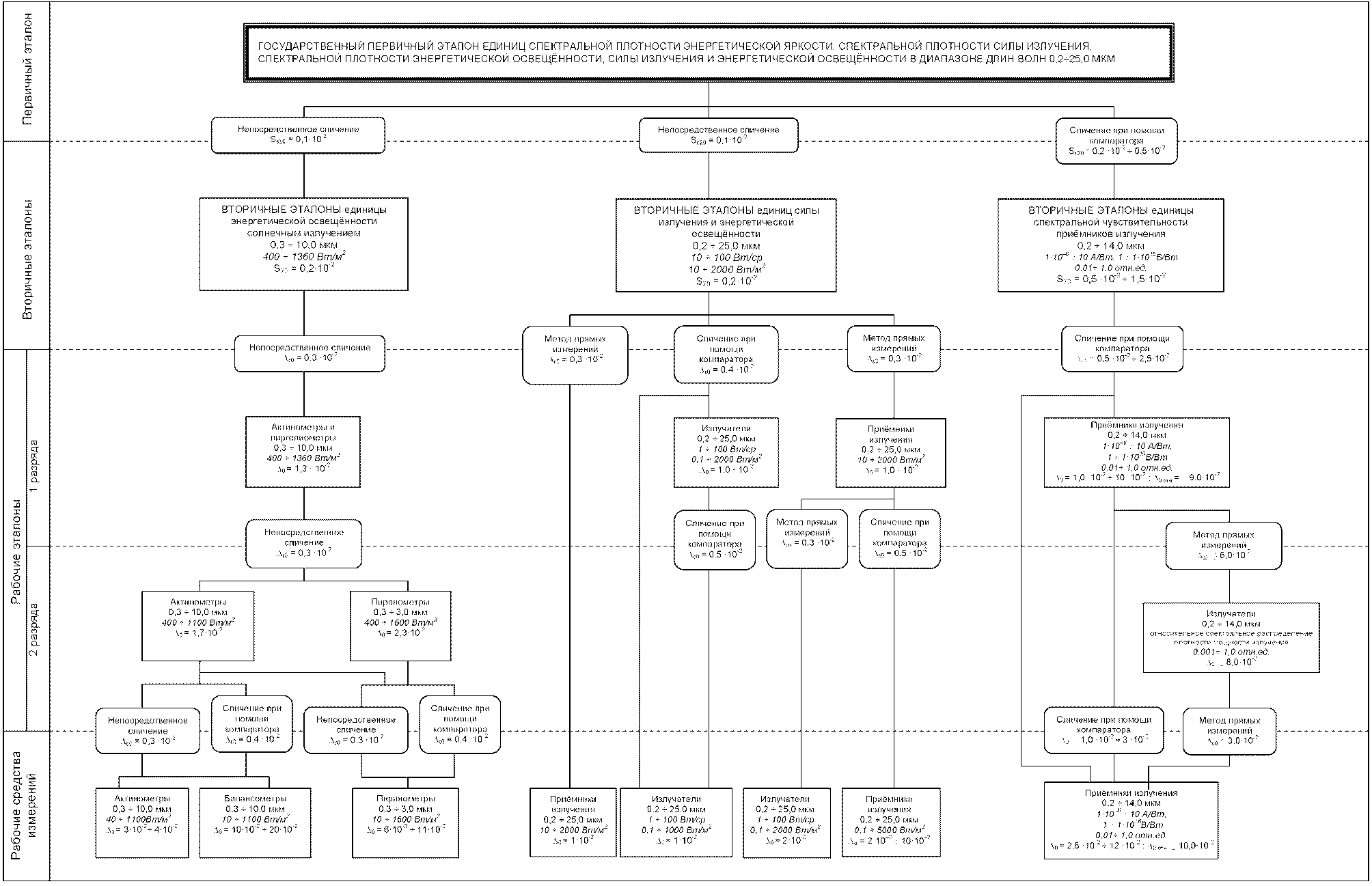 Поверочную схему возглавляет государственный первичный эталон единиц спектральной плотности энергетической яркости, спектральной плотности силы излучения, спектральной плотности энергетической освещенности, силы излучения и энергетической освещенности непрерывного оптического излучения в диапазоне длин волн от 0,2 до 25,0 мкм.