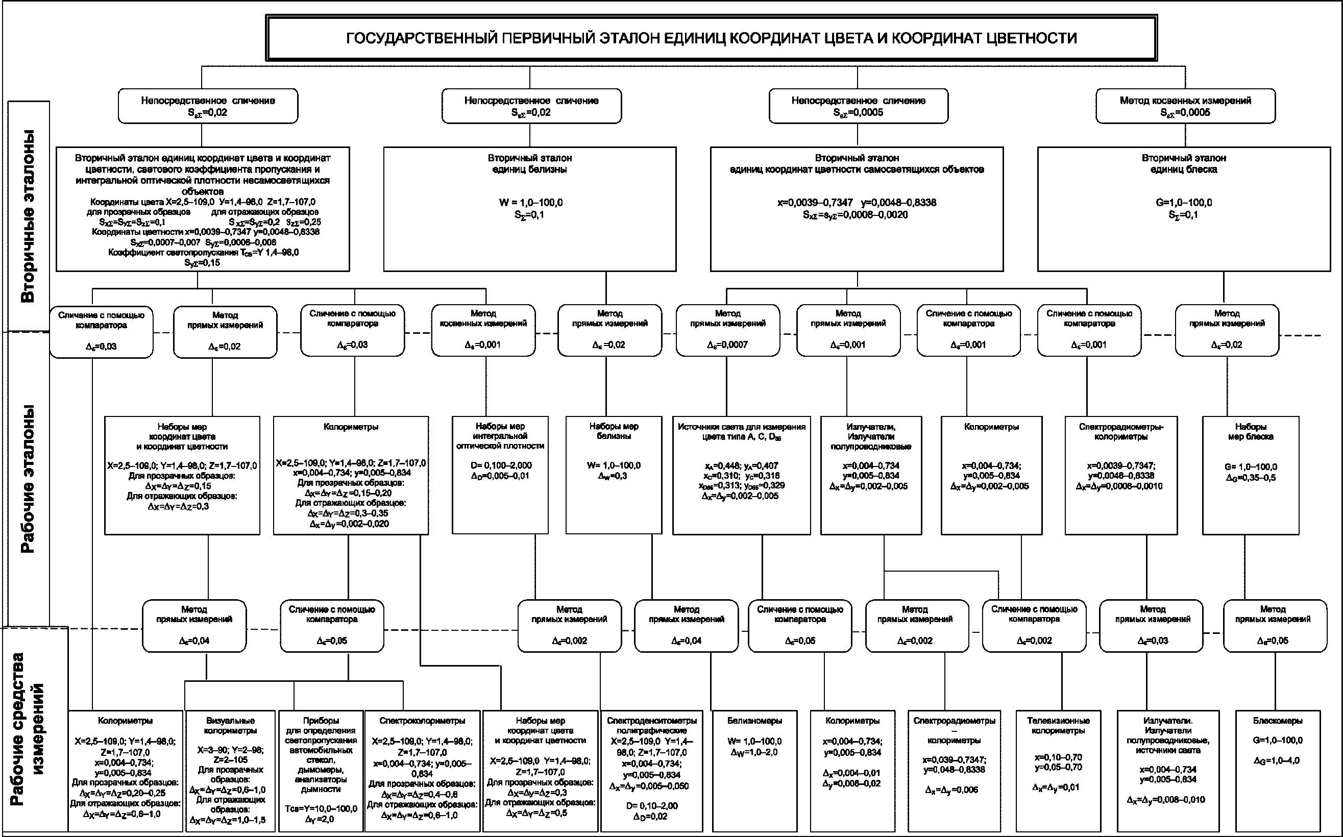2.1.1 Государственный первичный эталон применяют для воспроизведения, хранения и передачи единиц координат цвета (X, Y, Z) и координат цветности (x, y) вторичным эталонам непосредственным сличением и методом косвенных измерений.
