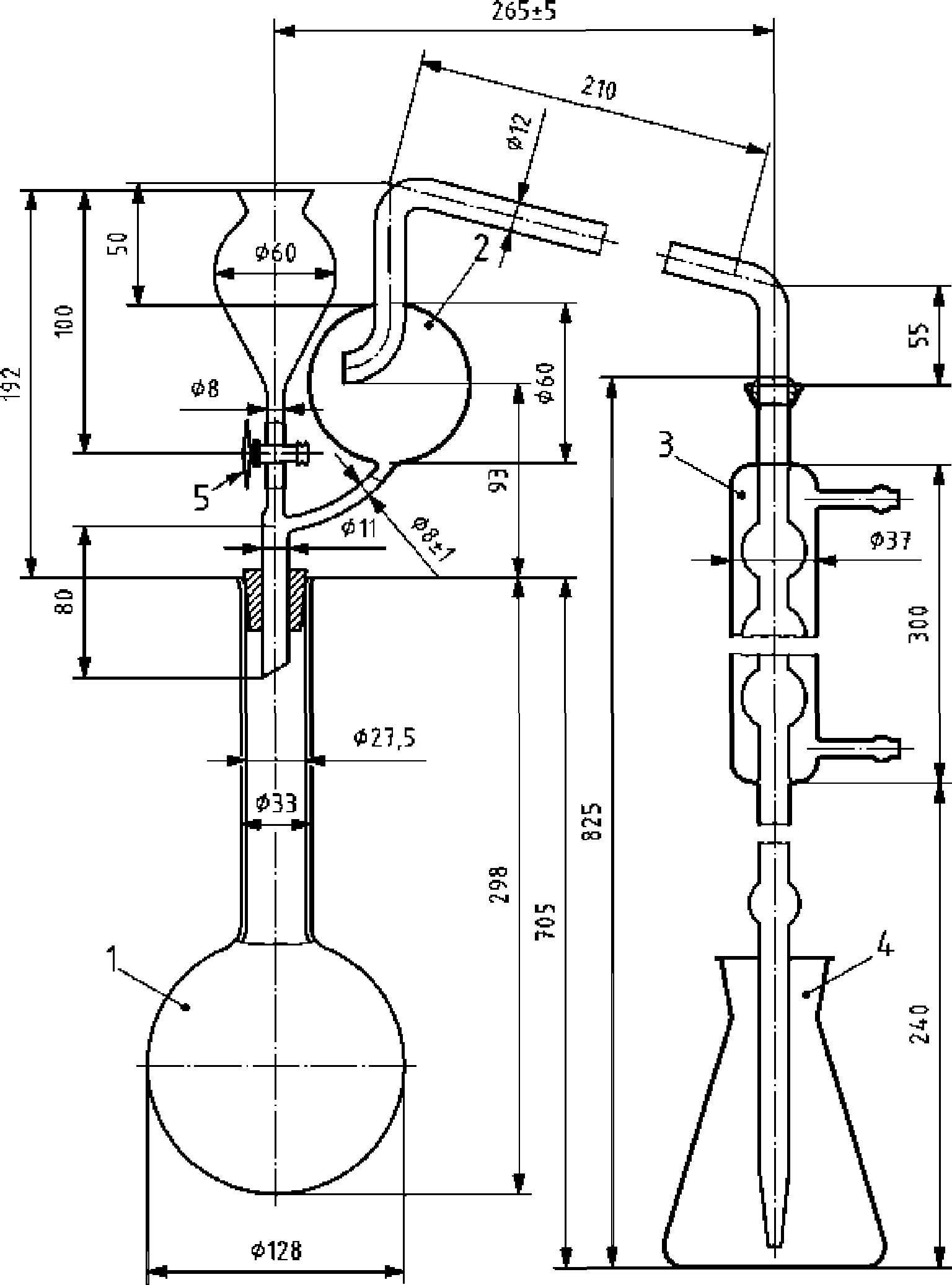 (5.18) и количество воды, достаточное, чтобы уровень жидкости был выше примерно на 5 см отверстия приемной трубки. Вводят через боковую горловину реакционной колбы воду так, чтобы довести раствор примерно до 50 мл, размешивают. Чтобы избежать пенообразования во время аэрации, добавляют несколько капель октилового спирта