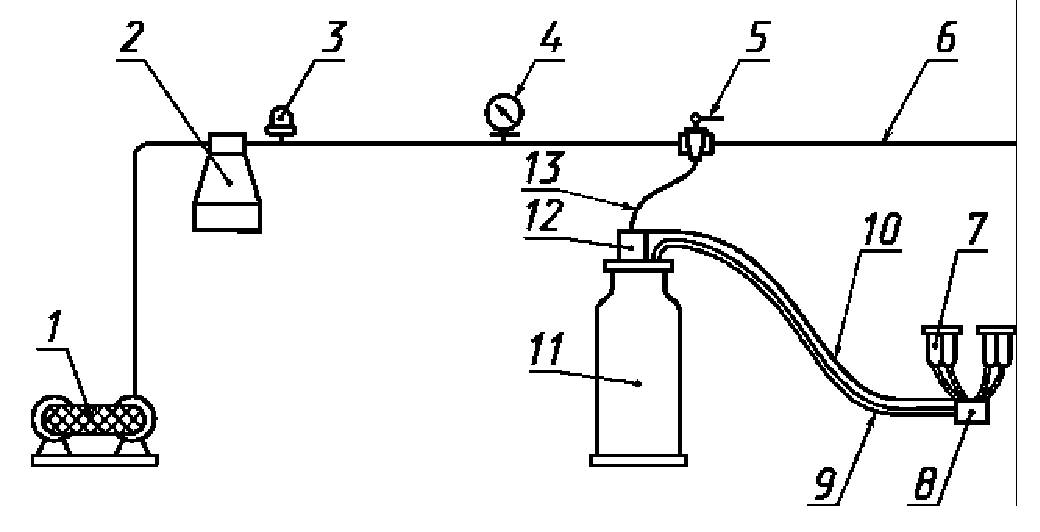 1 - вакуумный насос; 2 - вакуумный сосуд; 3 - регулятор; 4 - вакуумметр; 5 - вакуумный кран; 6 - воздушный трубопровод; 7 - стаканы для сосков; 8 - держатель; 9 - длинная трубка для молока; 10 - длинная пульсирующая трубка; 11 - емкость для молока; 12 - вибратор; 13 - вакуумная трубка